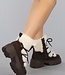 Diese Stiefel sind aus einem Stoff in Wildlederoptik gefertigt. Sie haben eine klobige Sohle mit einem niedrigen Blockabsatz. Die Stiefel sind mit Schnürsenkeln versehen, lassen sich aber auch leicht mit einem Reißverschluss an der Innenseite der Stiefel schließen. Die Stiefel sind mit Kunstpelz versehen und auch die Innenseite ist mit Kunstpelz ausgestattet.
