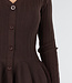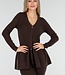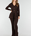 Dieses braune 2-teilige Set besteht aus einem Oberteil und einer Hose aus geripptem Stretchstoff. Das Oberteil hat einen V-Ausschnitt, lange Ärmel und Knopfverschlüsse auf der Vorderseite. Die Taille ist tailliert und läuft von dort aus weit in eine Peplum-Form aus. Die Hose hat eine hohe Taille mit elastischem Bund.