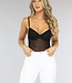 Dieser sexy Bodysuit ist perfekt für ein Festival. Der Body ist durchsichtig. Der Body ist an den Brüsten doppelt gefüttert, schimmert aber trotzdem ein wenig durch. Wir empfehlen daher, darunter einen Nippelschutz zu tragen. Der Body hat verstellbare Spaghettiträger und auf der Rückseite des Bodys befindet sich ein Hakenverschluss, der aus zwei Haken besteht, die man in drei Positionen einstellen kann. Am Rücken befindet sich ebenfalls ein Hakenverschluss, der aus drei Haken besteht und in drei Positionen verstellt werden kann. Der Bodysuit fällt zwischen den Pobacken.
