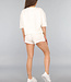 Diese Shorts sind aus einem Baumwoll-Stretch-Stoff gefertigt. Sie ist kurz geschnitten und hat einen elastischen Bund an der Taille. Dieser Bund ist außerdem mit einer Schnürung zum Anziehen versehen. Der Bund der Shorts besteht aus einem gerippten Stoff und diese Rippung findet sich auch an den Seiten der Shorts. Auf der Vorderseite hat die Hose zwei Einschubtaschen. Der untere Teil der Shorts ist beschnitten und ausgefranst. Die Shorts sind Teil eines Sets und werden separat verkauft.