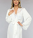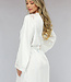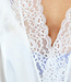 Dieser Kimono hat eine Satinoptik und fällt bis zur Hälfte des Unterschenkels. Er hat eine sehr schöne weiße Farbe. Die Ärmel sind lang und fallen locker. An der Taille befindet sich auf jeder Seite eine Schlaufe, durch die Sie das mitgelieferte Taillenband ziehen können, wenn Sie möchten. Durch dieses Band können Sie wählen, ob Sie den Kimono offen oder geschlossen tragen möchten. Was den Kimono abrundet, sind die Spitzenabschlüsse.