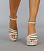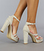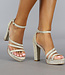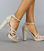 Diese Sandalen haben einen robusten Blockabsatz mit abgerundeter Spitze. Dieser Absatz ist rundum mit silberfarbenen Strasssteinen besetzt. Um den Knöchel verläuft ein Riemen mit einem verstellbaren Schnallenverschluss. Über den Vorderfuß verlaufen drei Riemen, und dann gibt es einen Peeptoe. Die Riemen der Fersen sind ebenfalls mit Glitter besetzt. Die Sandalen haben ein Plateau, das sie etwas höher erscheinen lässt, als sie tatsächlich sind.