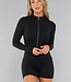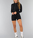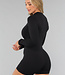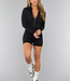 Dieser Bodysuit ist aus einem robusten, dicken Stretch-Stoff gefertigt und eignet sich perfekt für den Sport. Der Playsuit hat einen Reißverschluss an der Vorderseite, der bis zum Hals geschlossen werden kann. Die Ärmel sind lang und die Beine sind kurz.