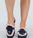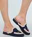 Diese dunkelblauen Slipper sind aus einem Material in Wildlederoptik mit einem weichen Teddy-Finish an den Rändern gefertigt. Die Innenseite ist vollständig mit dem gleichen Teddy-Stoff gefüttert, was für zusätzliche Wärme und Tragekomfort sorgt. An der Vorderseite befindet sich ein dekoratives Band mit goldfarbenem Detail. Die Sohle ist flach und leicht, wodurch der Schuh bequem zu tragen ist. Die abgerundete Spitze und das weiche Innenfutter machen diese Slipper ideal für den täglichen Gebrauch an kühleren Tagen.