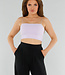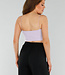 Dieses fliederfarbene Top ist kurz geschnitten und hat schmale Spaghettiträger. Das Oberteil ist eng anliegend und aus einem glatten, dehnbaren Material gefertigt, das viel Stretch enthält. Das gesamte Oberteil besteht aus einer doppelten Lage Stoff. Der Halsausschnitt ist gerade geschnitten. Der Rücken ist ebenfalls gerade geschnitten und liegt gut an.