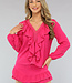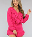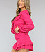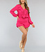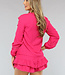 Dieses Set besteht aus einem Skort und einer Bluse. Der Skort hat einen elastischen Bund, so dass er leicht an- und ausgezogen werden kann. Der untere Teil des Rocks ist mit einer gefalteten Kante und einer Häkelborte versehen, die ihm einen böhmischen Look verleiht. Diese Borte findet sich auf der Vorder- und Rückseite des Rocks wieder. Die Bluse hat lange Ärmel mit elastischen Bündchen am Ende, die sie bauschig machen. Die Bluse hat einen V-Ausschnitt und die gefaltete Kante mit Häkelborte kehrt hier wieder.