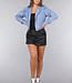 Diese abgeschnittene Jeansjacke ist aus einem Baumwollstoff gefertigt und nicht dehnbar. Sie hat lange Ärmel mit einem silbernen Knopfverschluss am Ende der Ärmel. Die Vorderseite der Jacke hat eine Klappe und ein tiefes Revers. Sie können die Jacke mit einem einzigen Knopf schließen. Die Jacke verfügt außerdem über eine dekorative Brusttasche.