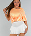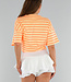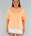 Dieses T-Shirt ist aus einem weichen Stoff mit horizontalen Streifen in Buttergelb und Orange gefertigt. Es hat eine gerade, lockere Passform mit Rundhalsausschnitt und abgesenkten Schulternähten. Die kurzen Ärmel sind etwas weiter und fallen locker.