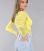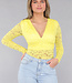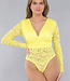 Dieser Body ist aus dehnbarem Spitzenstoff gefertigt und hat einen durchsichtigen Look. Der Bodysuit hat lange Ärmel und einen tiefen V-Ausschnitt. Er verfügt über feste Pads, die das Tragen eines BHs überflüssig machen. Außerdem ist der Body vorne doppelt gefüttert, so dass die Vorderseite oben nicht durchscheint. Unterhalb der Büste befindet sich ein plissiertes Band aus demselben Stoff. Der Boden des Bodys hat einen Hakenverschluss, der aus zwei Haken besteht, die in drei Positionen eingestellt werden können.