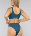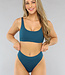 Dieser Bikini ist einfarbig und besteht aus einem gerippten Stoff. Das Oberteil hat zwei breite Schulterträger und herausnehmbare Pads. Der Träger auf der Rückseite ist geschlossen, aber Sie können das Oberteil leicht anziehen, indem Sie es über Ihren Kopf ziehen. Schön zu kombinieren mit der passenden Unterhose.