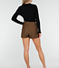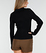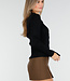 Diese schwarze Strickjacke ist aus geripptem Strickstoff gefertigt und hat eine figurbetonte Passform. Das Modell verfügt über Knopfverschlüsse auf der Vorderseite und einen klassischen Kragen. Die langen Ärmel sind eng anliegend und folgen dem vertikalen Rippenmuster. Die Knöpfe sind braun und dezent entlang der Öffnung angebracht. Die Strickjacke reicht bis zur Hüfte.