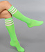 Diese Socken reichen bis unter das Knie und sind aus einem dehnbaren Stoff gefertigt. Sie sind neongrün und haben drei weiße Streifen am oberen Ende.