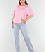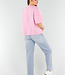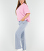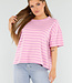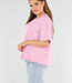 Dieses T-Shirt ist aus einem weichen Stoff mit horizontalen Streifen in Hellrosa und Lila gefertigt. Es hat eine gerade, lockere Passform mit Rundhalsausschnitt und abgesenkten Schulternähten. Die kurzen Ärmel sind etwas weiter und fallen locker.