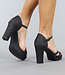 Diese Sandalen haben einen robusten Blockabsatz mit abgerundeter Spitze. Um den Knöchel ist ein Riemen mit verstellbarem Schnallenverschluss angebracht. Über den Vorderfuß verlaufen drei Riemen, und dann gibt es einen Peeptoe. Die Sandalen haben ein Plateau, das sie etwas höher erscheinen lässt, als sie tatsächlich sind.