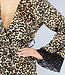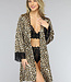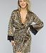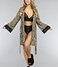 Dieser Kimono hat einen Satin-Look und fällt bis zur Mitte des Oberschenkels. Er hat einen sehr hübschen Leopardendruck. Die Ärmel sind lang und fallen locker. An der Taille befindet sich auf jeder Seite eine Schlaufe, durch die Sie das mitgelieferte Taillenband stecken können, wenn Sie möchten. Durch dieses Band können Sie wählen, ob Sie den Kimono offen oder geschlossen tragen möchten. Der Kimono ist mit einer schwarzen Spitzenborte verziert.