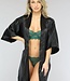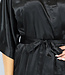 Dieser Kimono hat eine Satinoptik und fällt bis zur Mitte des Oberschenkels. Er hat eine sehr schöne schwarze Farbe. Die Ärmel sind lang und fallen locker. An der Taille befindet sich auf jeder Seite eine Schlaufe, durch die Sie das mitgelieferte Taillenband ziehen können, wenn Sie möchten. Durch dieses Band können Sie wählen, ob Sie den Kimono offen oder geschlossen tragen möchten.