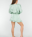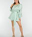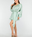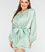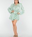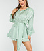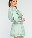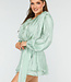 Dieses schicke Kleid in zartem Mintgrün ist aus einer glänzenden, leichten und atmungsaktiven Mischung gefertigt, die sanft über den Körper fällt. Auf der Vorderseite befindet sich eine verspielte Schleife, die die Taille akzentuiert. Die langen Ärmel sind an den Handgelenken mit einem Gummizug versehen, der ihnen einen leicht bauschigen Fall verleiht. Der Rock ist mehrlagig und hat am unteren Ende eine dezente Falte. Dieses Kleid ist ideal für festliche Anlässe oder einen Abend im Freien. Die Kordel am Halsausschnitt kann geknotet oder aufgeknöpft werden, um einen verspielten Effekt zu erzielen. Das Kleid ist mit Schulterpolstern versehen.