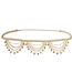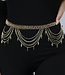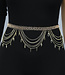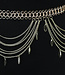 Diese Körperkette ist ein echter Hingucker! Sie hat ein breites Band, das aus mehreren miteinander verbundenen Ringen besteht. Auf der Rückseite befindet sich ein verstellbarer Karabiner-Verschluss. Darum herum sind mehrere Ketten, die in einem Halbbogen fallen. Alle diese Ketten sind mit kleinen Anhängern versehen.