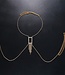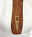 Diese Körperkette ist perfekt, wenn Sie ein tiefes Dekolleté und einen besonderen Anlass haben. Die Kette ist mit Glitzersteinen besetzt. Das große Quadrat sitzt in der Mitte der Brust und läuft zum Hals und unter der Brust hinunter. Die Körperkette ist mit zwei Karabinerverschlüssen versehen.