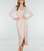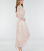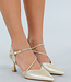 Diese Pumps sind aus goldfarbenem Glitzermaterial gefertigt. Das Modell hat eine spitze Zehenpartie und einen offenen Fersenbereich. Über den Spann verlaufen schmale Riemchen, die mit Glitzer verziert sind und um den Knöchel herum mit einem verstellbaren Riemchen und einer Schnalle geschlossen werden.