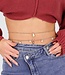 Diese goldene Körperkette besteht aus zwei feinen Gliederketten, die elegant um die Taille fallen. An der Kette hängen glänzende Perlenanhänger in verschiedenen Formen, darunter eine auffällige tropfenförmige Perle als Mittelpunkt. Die Kette hat einen verstellbaren Verschluss auf der Rückseite, sodass die Passform leicht angepasst werden kann.