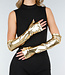 Diese goldfarbenen langen Handschuhe haben einen auffälligen Metallic-Glanz und sind aus geschmeidigem Stretchmaterial gefertigt. Die offenen Fingerspitzen machen sie praktisch und verleihen dem Design einen coolen Akzent. Ideal zu kombinieren mit einem festlichen oder futuristischen Outfit.
