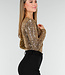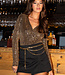 Dieser goldene Body ist vollständig mit Pailletten bedeckt und hat einen überlappenden V-Ausschnitt. Der Body hat lange Ärmel und eine figurbetonte Passform. Der untere Rand ist hoch ausgeschnitten und die Rückseite ist glatt verarbeitet.