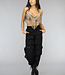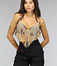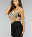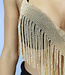 Dieses Top ist absolut unverzichtbar und zieht sofort die Aufmerksamkeit auf sich. Es ist aus roségoldfarbenem, verspiegeltem Mikrominze gefertigt. Das Top ist kurz geschnitten und hat Spaghetti-Träger aus Ketten. Das Oberteil lässt sich ganz einfach schließen, da hinten zwei Ketten mit Karabinerverschlüssen angebracht sind.