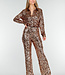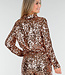 Goldfarbene Bluse, vollständig mit glänzenden Pailletten bedeckt. Das Modell hat einen Kragen und lange Ärmel mit geradem Abschluss an den Manschetten. Die Vorderseite wird mit einer schmalen Knopfleiste geschlossen, die sich dezent zwischen den Pailletten verliert. Die glitzernde Textur verleiht dem Ganzen einen auffälligen, festlichen Look.