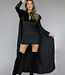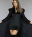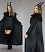 Das Kleid ist kurz und hat lange Ärmel. Es hat einen tiefen V-Ausschnitt mit einer hübschen Schnürung, die Sie offen oder geschlossen tragen können. Zu diesem Kostüm gehört auch ein langer schwarzer Umhang mit Federn. Dieses Kostüm ist perfekt für Halloween!