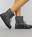 Stichworte: graue gepolsterte Step-in-Schneestiefel, warme Stiefeletten mit Kunstfell, Schnürung, klobige Sohle, Plateausohle, Kunstfell, Moonboots, Lederoptik, Wildlederoptik