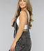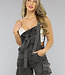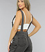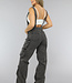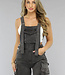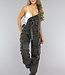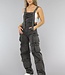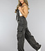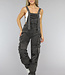 Dieser Anzug ist aus einem robusten Denim-Stoff gefertigt. Er hat einen allgemeinen Schnitt, das heißt, der Anzug hat über die Schulter verlaufende Schulterriemen. Auf der Vorderseite hat er eine große Tasche auf dem Bauch. Sowohl die linke als auch die rechte Seite haben einen Knopfverschluss mit zwei Knöpfen unter einander. Diese dienen dazu, dass die Hose leichter angezogen werden kann. Der Boden des Jumpsuits hat viele Cargotaschen.