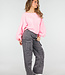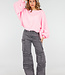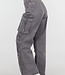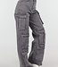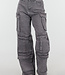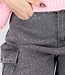 Diese Cargohose ist aus grauem Denimstoff gefertigt und mit kleinen Strasssteinen über die gesamte Oberfläche verteilt. Das Modell hat eine hohe Taille mit Gürtelschlaufen und einen Knopf- und Reißverschluss vorne. Die Hose hat Seitentaschen, Gesäßtaschen und mehrere aufgesetzte Cargotaschen an den Oberschenkeln und Unterschenkeln. Die Hosenbeine fallen gerade und weit bis über den Knöchel. Die Hose enthält einen leichten Stretchanteil.
