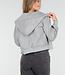 Diese graue Strickjacke ist aus weichem Sweatstoff gefertigt und mit einer Kapuze versehen. Die Vorderseite wird mit einem durchgehenden Reißverschluss geschlossen, wodurch sie leicht zu tragen ist. Das Modell hat lange Ärmel mit gerippten Bündchen und einen geraden Saum unten. Die Strickjacke hat eine lockere, bequeme Passform und reicht bis zur Hüfte.
