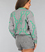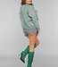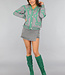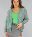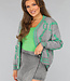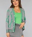 Diese Strickjacke hat lange Ärmel und einen übergroßen Schnitt. Sie hat einen V-Ausschnitt und auf der Vorderseite einen Knopfverschluss, der aus vier großen Knöpfen besteht. Außerdem ist diese Strickjacke mit einem Muster versehen.
