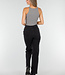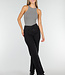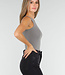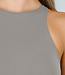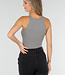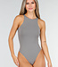 Dieser graue Body besteht aus einem glatten, dehnbaren Stretchmaterial, das sich eng an den Körper anschmiegt. Der hohe Rundhalsausschnitt und die breiten Träger sorgen für eine vollständig bedeckte Oberseite. Auf der Rückseite ist das Modell mit einem stringförmigen Unterteil ohne sichtbare Nähte ausgestattet. Der Rücken ist geschlossen und das Design hat einen ärmellosen Abschluss. Der Body wird an der Unterseite mit Druckknöpfen geschlossen.