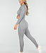 Dieser graue Jumpsuit ist aus einem gerippten, elastischen Stoff gefertigt und liegt eng am Körper an. Das Modell hat lange Ärmel und einen Reißverschluss vorne bis zur Mitte der Brust. Der Ausschnitt ist mit einem kleinen Stehkragen versehen und die Hosenbeine sind an den Knöcheln eng geschnitten.