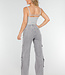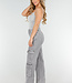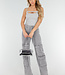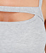 Dieses graue Top aus Melange-Stoff hat Spaghetti-Träger und einen auffälligen Ausschnitt auf der Vorderseite. Das Oberteil ist aus einem bequemen Stretch-Stoff gefertigt und hat eingesetzte Pads für zusätzlichen Halt. Es hat eine gute Passform und bietet hohen Tragekomfort. Die Träger sind schmal und das Material fühlt sich weich an.