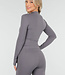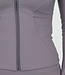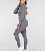 Dieses graue 2-teilige Set besteht aus einer eng anliegenden Leggings mit hoher Taille und einer taillierten Strickjacke. Die Strickjacke hat einen Stehkragen, lange Ärmel mit Daumenlöchern und einen durchgehenden Reißverschluss vorne. Beide Teile sind aus einem glatten und elastischen Stoff gefertigt. Die Leggings sind bis zu den Knöcheln eng geschnitten und die Strickjacke reicht bis zur Hüfte.