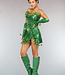 Das schöne Kleid ist mit grünen Pailletten und Blättern verziert. Außerdem hat das Kleid transparente, verstellbare Spaghetti-Träger, die man auch abnehmen kann. An der Seite des Kleides befindet sich ein blinder Reißverschluss. In den Handschuhen befinden sich Fingerlöcher, so dass man die Finger durchstecken kann und die Ärmel nicht verliert.