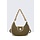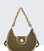 Diese olivgrüne Umhängetasche ist aus Wildleder gefertigt und an den Rändern mit einem beigen Fellbesatz verziert. Die Tasche hat einen kurzen Schulterriemen mit goldenen Kettengliedern, die mit weichem Stoff umwickelt sind. Die Vorderseite ist mit einer Klappe mit goldfarbenem Drehverschluss versehen, während die Oberseite für zusätzliche Sicherheit auch einen Reißverschluss hat. Die halbrunde Form und die Materialkombination verleihen diesem Modell einen auffälligen Charakter. Die dezente Verwendung von Fell und Metall sorgt für ein luxuriöses Finish, das sich sowohl für den Alltag als auch für Abendlooks eignet. Zu dieser Tasche gehört auch ein extra langer Henkel.