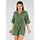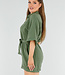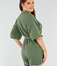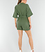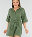 Dieser khakigrüne Playsuit ist aus 100 % Baumwolle mit einer luftigen Musselinstruktur gefertigt. Der Playsuit hat einen klassischen Hemdkragen mit durchgehendem Knopfverschluss vorne. In der Taille befindet sich ein Schleifengürtel aus demselben Stoff, mit dem die Passform angepasst werden kann. Die kurzen Ärmel sind weit und haben einen festen Umschlag. Die Shorts sind locker geschnitten und leicht ausgestellt mit einem festen Saum. Der Baumwollstoff ist nicht dehnbar und fühlt sich leicht und atmungsaktiv an. Ideal für Sommertage.