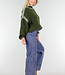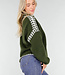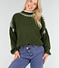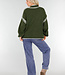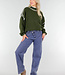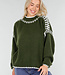 Dieser grüne Strickpullover hat einen hohen Kragen und auffällige weiße Details an den Schultern und Ärmelbündchen. Der Pullover ist aus einem groben Strick mit einer weichen, flauschigen Textur gefertigt, die sich angenehm anfühlt und Wärme spendet. Die lockere Passform und die langen Ärmel sorgen für einen entspannten und gemütlichen Look. Perfekt zu kombinieren mit einer Jeans oder einem Rock für einen stilvollen Winterlook.