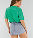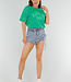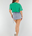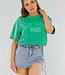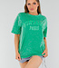 Dieses grüne T-Shirt hat einen Acid-Wash-Druck und ist auf der Vorderseite mit dem Wort "Vintage Paris" in neonpinken Buchstaben bedruckt. Es hat eine gerade Passform mit Rundhalsausschnitt und kurzen Ärmeln, die aufgrund der Oversized-Passform bis zur Mitte des Arms reichen. Das Shirt ist aus dehnbarem Material gefertigt, das sich angenehm an den Körper anpasst.