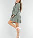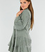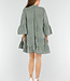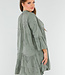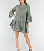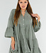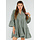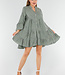 Dieses khakigrüne Kleid ist aus 100 % Baumwolle gefertigt und hat eine leichte, atmungsaktive Struktur. Es hat eine kurze Länge mit einem ausgestellten Rock, der mit einem Volantsaum abschließt. Das Kleid wird vorne mit Knöpfen geschlossen und hat einen Stehkragen mit einer kleinen V-Kerbe. Die Ärmel sind dreiviertellang und gehen in eine weite Trompetenform über. Ton-in-Ton gestickte Blumenmotive sind über den Stoff verteilt. Das Kleid hat keinen Stretchanteil und fällt locker um den Körper.