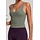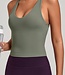 Dieses Oberteil ist aus grünem, glattem und elastischem Material mit matter Oberfläche gefertigt. Das Modell hat eine figurbetonte Passform und ist ärmellos. Der Ausschnitt ist tief und vorne abgerundet, und das Oberteil hat breite Träger. Auf der Rückseite hat das Oberteil gekreuzte Träger, die für eine stabile Konstruktion und zusätzlichen Halt sorgen. Das Oberteil ist mit herausnehmbaren Polstern ausgestattet, sodass die Abdeckung nach Wunsch angepasst werden kann.