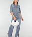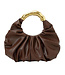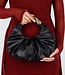 Handtasche in einfarbiger Ausführung mit gefalteter Struktur. Das Modell hat ein kompaktes Format und einen festen, runden Griff aus goldfarbenem Metall. Die Tasche hat einen Druckknopfverschluss an der Oberseite.
