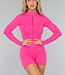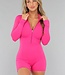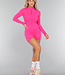 Dieser Bodysuit ist aus einem robusten, dicken Stretch-Stoff gefertigt und eignet sich perfekt für den Sport. Der Playsuit hat einen Reißverschluss an der Vorderseite, der bis zum Hals geschlossen werden kann. Die Ärmel sind lang und die Beine sind kurz.