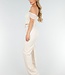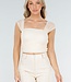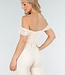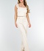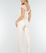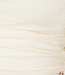 Dieses Oberteil ist aus einem hellbeigen, gefütterten Netzstoff mit viel Stretchanteil. Es kann schulterfrei getragen werden und hat einen plissierten Drapierungseffekt über das gesamte Oberteil. Der Stoff fällt weich und das Oberteil kann entweder mit den Trägern über den Schultern oder schulterfrei getragen werden. Die Farbe ist hellbeige und das Material ist leicht transparent.