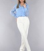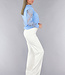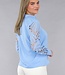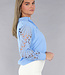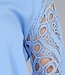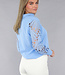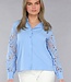 Diese Bluse ist aus einem fließenden, nicht dehnbaren Stoff gefertigt. Die Bluse hat einen umgeschlagenen Kragen und ist mit einem Knopfverschluss aus sechs Knöpfen versehen. Die Ärmel der Bluse sind lang und bestehen aus einem gehäkelten Pfauenmuster. Dadurch sind die Ärmel auch durchsichtig. Die Manschetten an den Ärmeln sind tailliert und mit einem doppelten Knopfverschluss versehen.